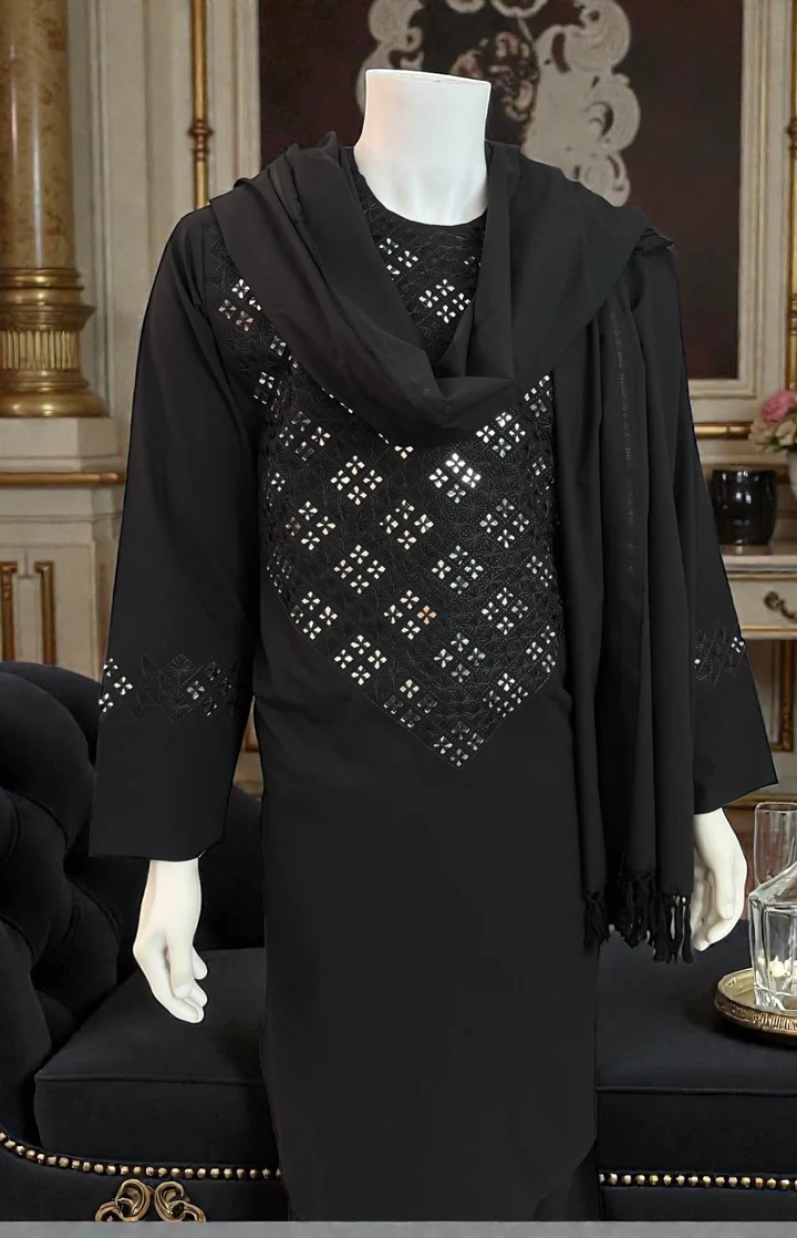 Small Black Parahan Tunban with Heavy Gold Shesha Mirror Work and Matching Shawl Set — Tailored Fit for Tall Person