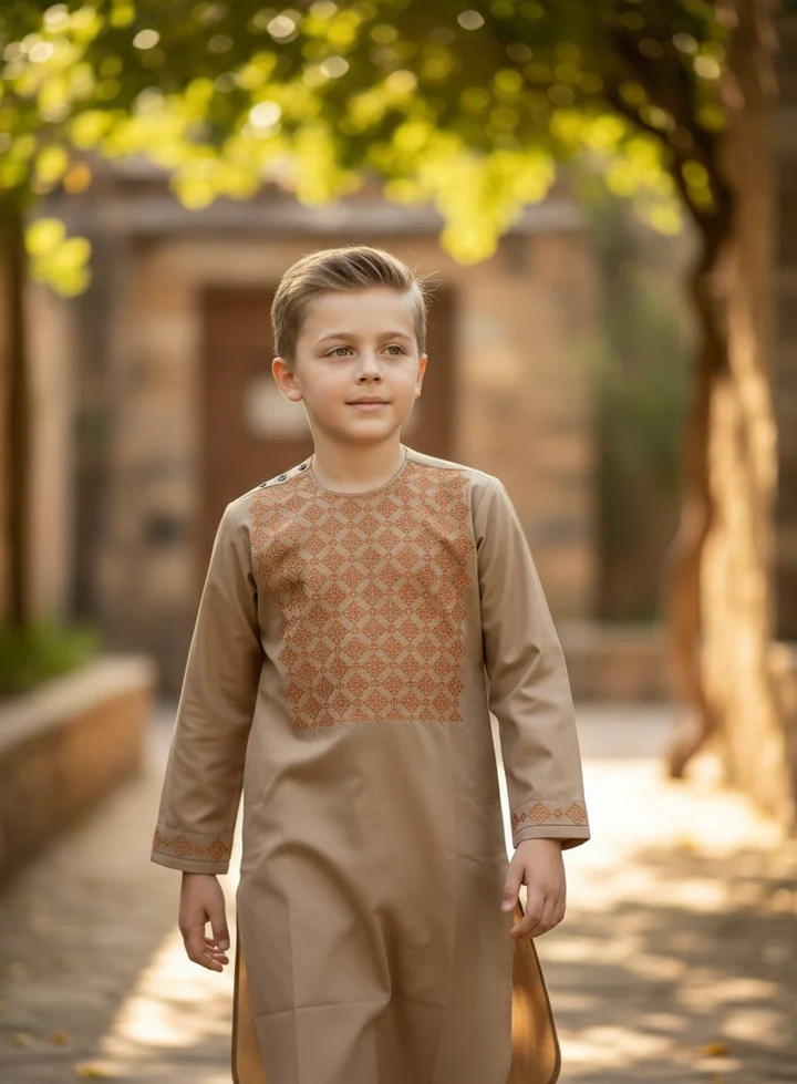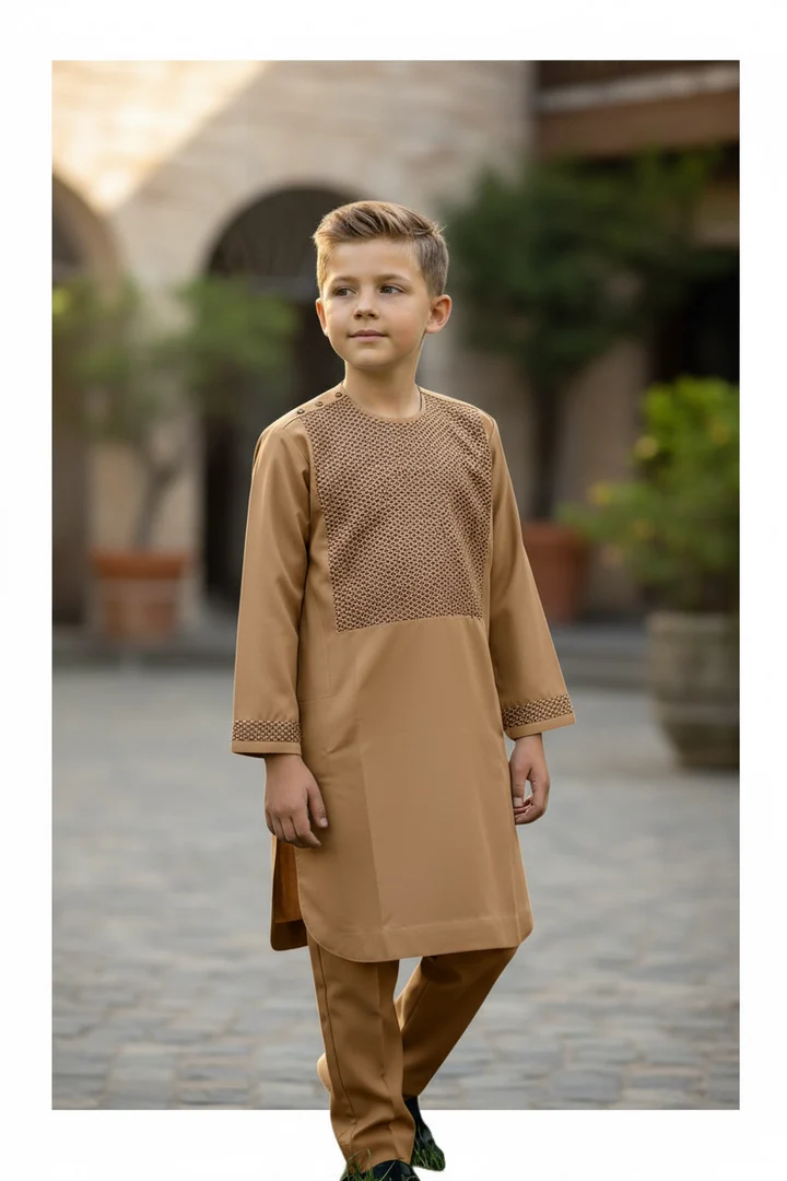 Beige Afghan Parahan Tumban for Boys 8–9 Years | Matching Brown Machine Khamak Embroidery | Traditional Kids Outfit #2800