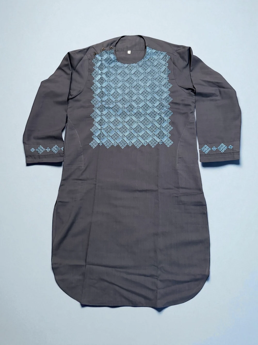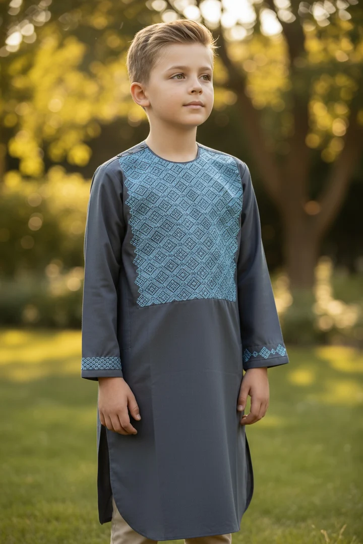 Gray Afghan Parahan Tumban for Boys 8–9 Years | Light Blue Machine Khamak Embroidery | Traditional Kids Outfit by Luqmaan Boutique #2796