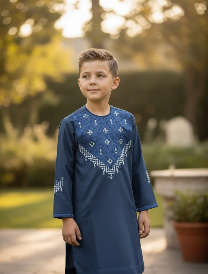 Boys Navy Blue Parahan Tumban – Machine Khamak Embroidery in White & Matching Blue (8-9 Years) | Luqmaan Boutique #2780