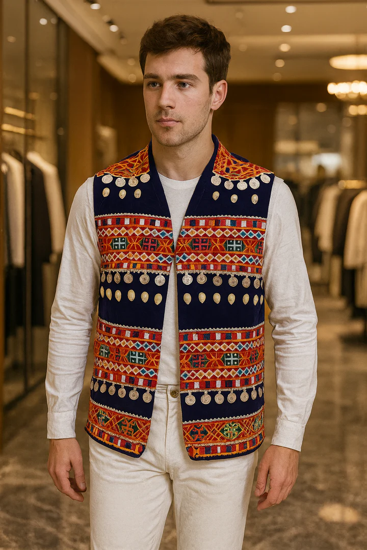 Men’s Navy-Blue Afghan Vest with Hand Embroidery, Shells & Silver Coins | Traditional Kuchi Waistcoat | Size Small | Luqmaan Boutique #2425