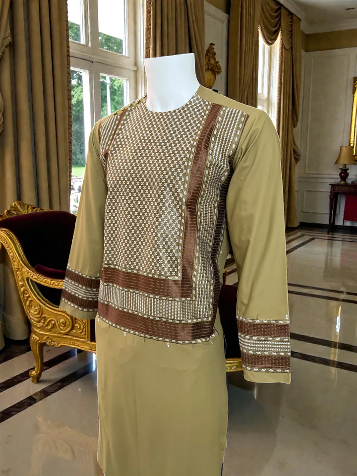 Men’s Parahan Tunban with Premium Geometric Embroidery – Henna Green Afghan Traditional Outfit – Small #2868