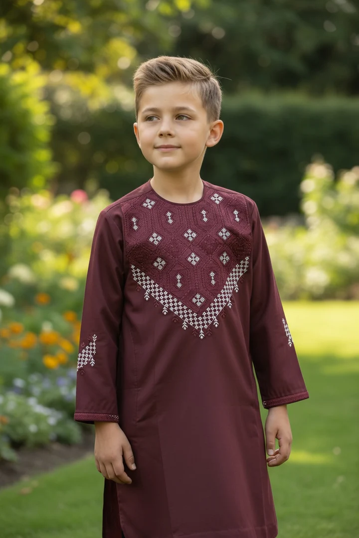 Maroon Afghan Parahan Tumban for Boys 8–9 Years | Matching White Machine Khamak Embroidery | Traditional Outfit by Luqmaan Boutique #2792