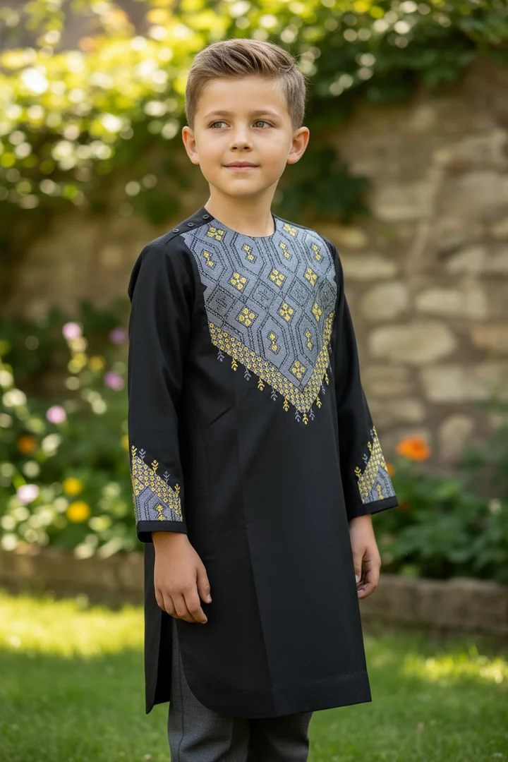 Boys Dark Gray Parahan Tumban – Machine Khamak Embroidery in Gold & Gray (8–9 Years) | Luqmaan Boutique #2784