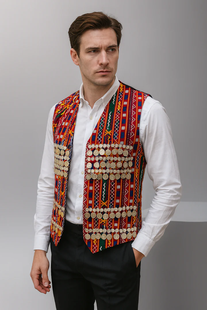 Men’s Traditional Afghan Vest with Multicolor Embroidery and Gold Coinwork | Handmade Waistcoat | Size Large | Luqmaan Boutique #2432