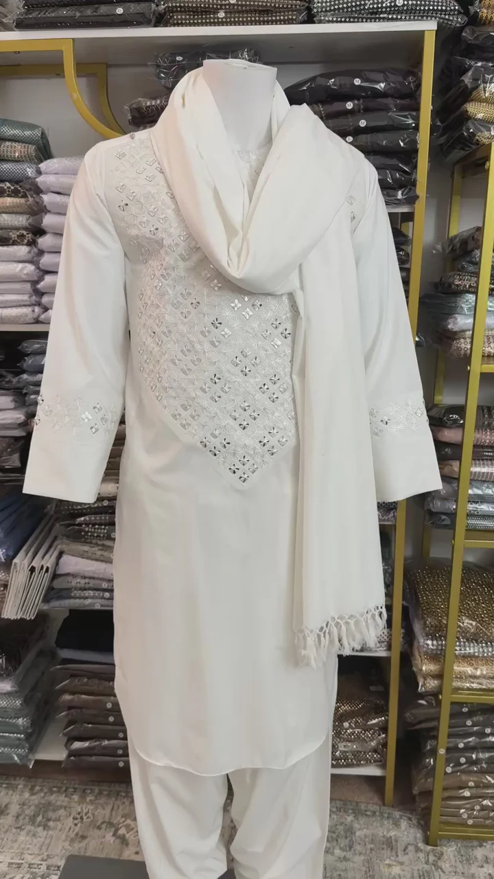 Men’s Off-White Handmade Mirror Work Afghan 3-Piece Traditional Outfit for Weddings & Cultural Events – Medium #2835