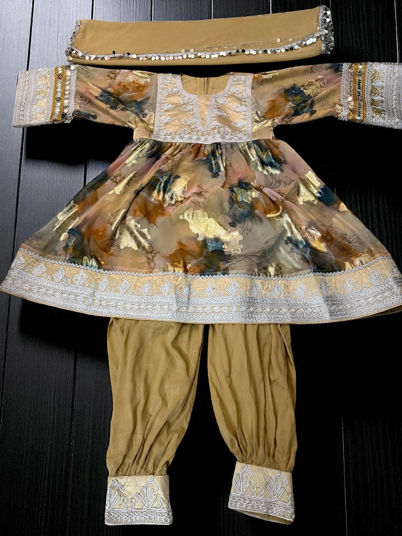 This graceful Afghan women’s 3-piece Kochi dress is crafted from soft, lightweight chiffon and finished with traditional Chermadozi embroidery. Designed in an elegant beige-gold tone with artistic gold woven accents, this outfit reflects authentic Afghan heritage with a warm, luxurious look.